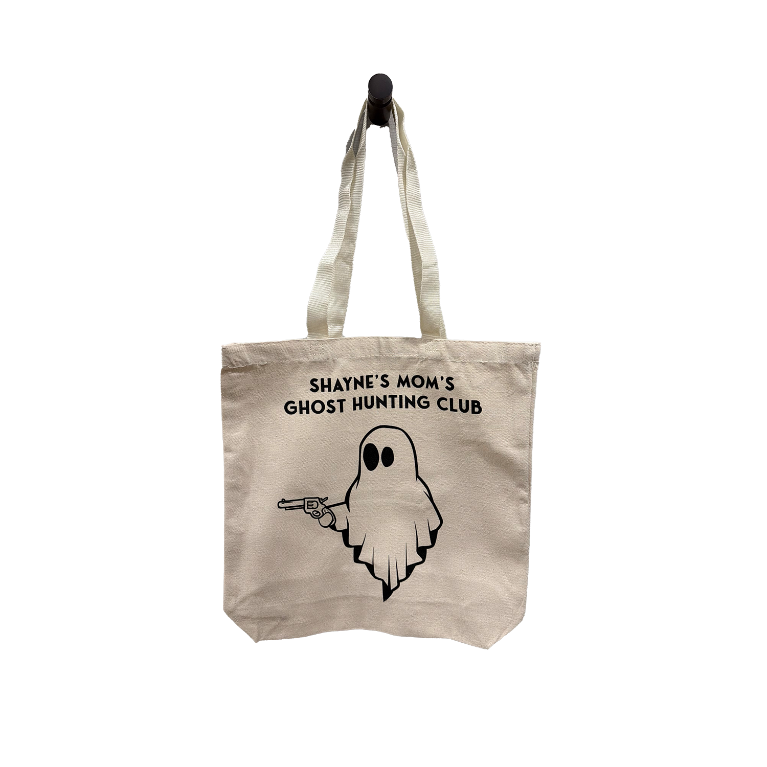 Shayne Smith's Mom's Ghost Hunting Club lightweight natural canvas tote. Approximately 15" x 15".